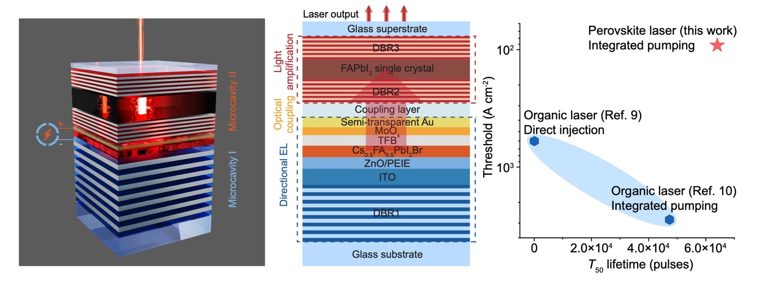 Zařízení údajně účinně spojuje velké množství fotonů generovaných elektricky buzenou mikrodutinovou perovskitovou LED do druhé mikrodutiny. Tam jsou buzeny monokrystalickým perovskitovým ziskovým médiem, které generuje laser s účinností vazby až 82,7 %. Startovací proud potřebný ke spuštění tohoto nového polovodičového laseru je 92 ampérů na čtvereční centimetr, řádově vyšší než u nejlepších elektricky poháněných organických laserů, a vykazuje vynikající stabilitu.