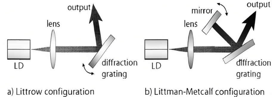 Lasery s krátkou dutinou, jako jsou DFB a DBR, mají omezenou dobu interakce fotonů uvnitř dutiny, což ztěžuje hlubokou kompresi šířky čáry. Pro další kompresi šířky čáry a potlačení šumu se takové konfigurace s krátkou hlavní dutinou často kombinují se strukturami s vnější dutinou pro optimalizaci výkonu. Běžné struktury s vnějšími dutinami zahrnují prostorové vnější dutiny, vnější dutiny vláken a vnější dutiny vlnovodu. Před vývojem zařízení s optickými vlákny a vlnovodných struktur byly vnější dutiny složeny převážně z prostorové optiky kombinované s diskrétními optickými součástmi. Mezi nimi, mřížkové struktury založené na prostorové vnější dutině zpětné vazby převážně přebírají návrhy Littrow a Littman, typicky sestávající z dutiny pro zisk laseru, spojovacích čoček a difrakční mřížky. Mřížka jako prvek zpětné vazby umožňuje ladění vlnové délky, výběr režimu a kompresi šířky čáry.