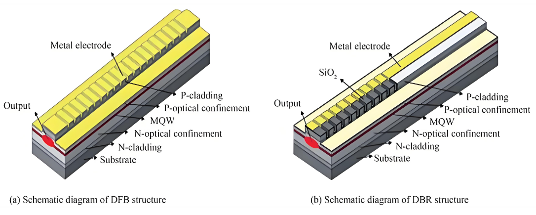 Technická výzva laserů DFB spočívá ve výrobě mřížkových struktur. Existují dvě primární metody pro výrobu mřížek v polovodičových laserech DBR: sekundární epitaxe a povrchové leptání. Polovodičové lasery RGF-DFB využívají sekundární epitaxi a fotolitografii k růstu sady mřížek s nízkým indexem lomu v aktivní oblasti. Tato metoda zachovává strukturu aktivní vrstvy s nízkou ztrátou, což usnadňuje výrobu vysoce Q rezonátorů. Polovodičové lasery s povrchovou mřížkou (SG)-DFB zahrnují přímé leptání vrstvy mřížky na povrch aktivní oblasti. Tento přístup je složitější, vyžaduje přesné nastavení podle materiálu aktivní oblasti a dopingových iontů a vykazuje vyšší ztráty, přesto nabízí silnější optické omezení a vyšší schopnost potlačení režimu.